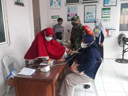 KEBUMEN - Babinsa Koramil 04 Karanganyar Pelda Sunarko melaksanakan pengamanan dan pendampingan vaksinasi tahap 1 dan tahap 2 bagi Lansia dan pelayan publik Kelurahan Karanganyar di Puskesmas Nirmolo Karanganyar.