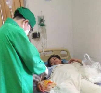 PEMALANG - Pimred Media Realita News (MRN) Ardhi Solehudin memberikan bantuan kepada Jaelani warga yatim piatu di Desa Semaya, Kecamatan Randudongkal Kabupaten Pemalang yang saat ini dirawat di RS Wardi Mulya, karena sakit gangguan pencernaan dan tumor (8/10).